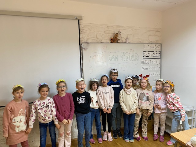 100. dan škole obilježili smo u petak,13.2.2026. Tog dana sve je bilo u znaku broja 100. Na satu Hrvatskog jezika pisali smo 100 različitih riječi koje smo naučili u prvom razredu. Na satu Tjelesne i zdravstvene kulture napravili smo 100 vježbi razgibavanja. Pokušali smo i našim tijelimaoblikovati broj 100. Na Matematici smo riješili 100 zadataka. Posebne, slavljeničke krune izrađivali smo i bojali na satu Likovne kulture. Pokušali smo i zamisliti kako ćemo izgledati kao stogodišnjaci. Našu proslavu uljepšali su i baloni. Cijeli dan je bio baš zanimljiv i veseo.